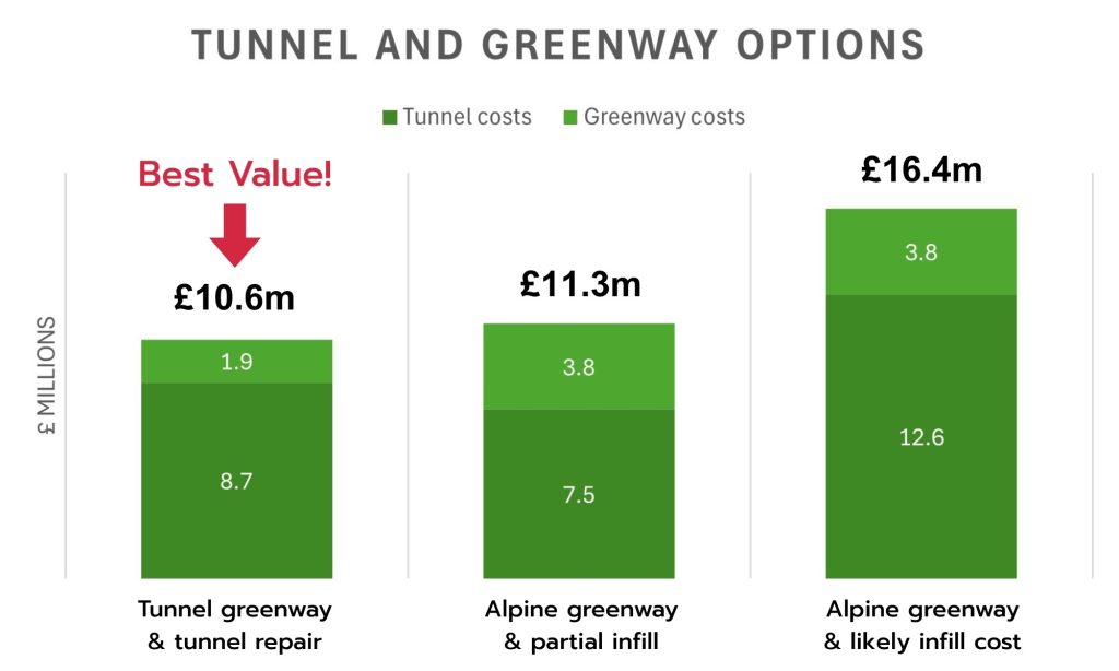 When the government now says the tunnel route is more expensive it’s because they are including the remedial work needed on the tunnel in the total. Yet they are ignoring the cost of blocking up the tunnel permanently, something they would need to do to justify pursuing a compromised surface route. When you add everything up you find that restoring the tunnel and building a greenway through it is the cheapest of all the options.